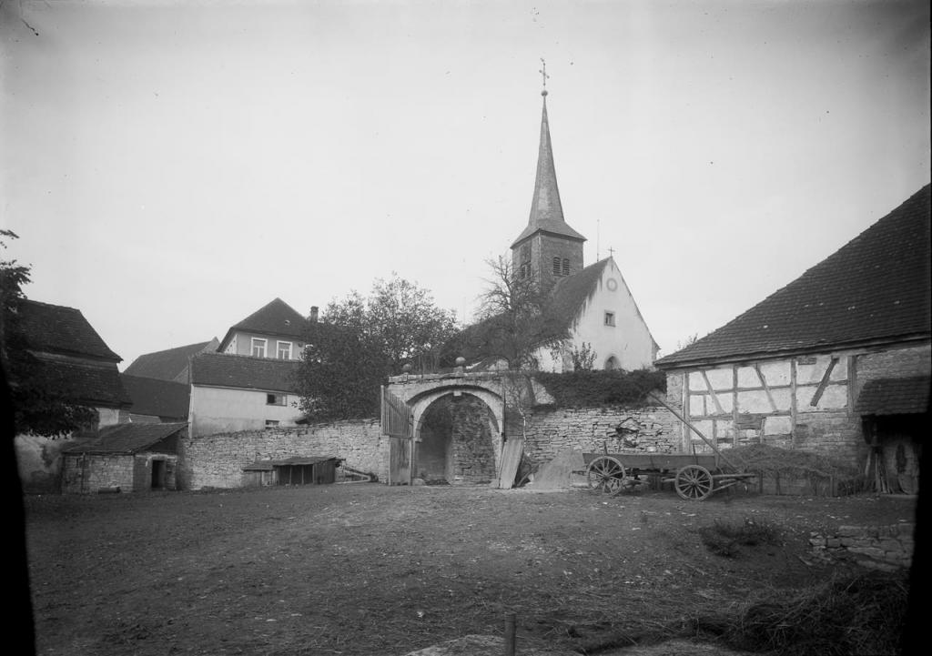 • um 1700 Schiff verlängert, an der Nordseite Spitzbogenfenster erhalten