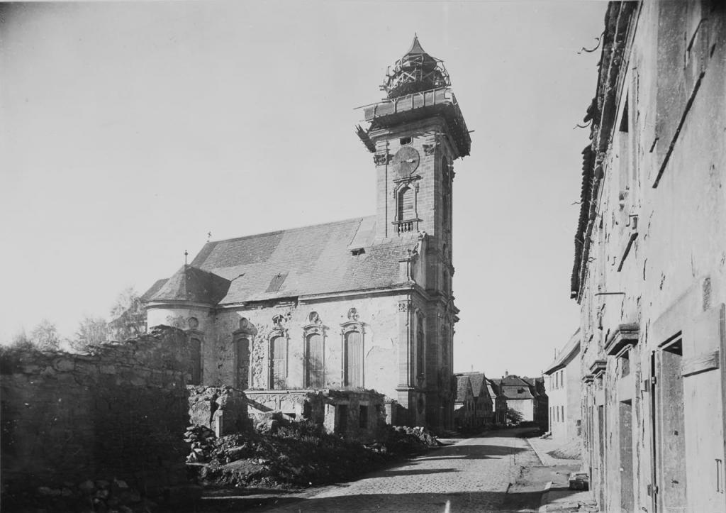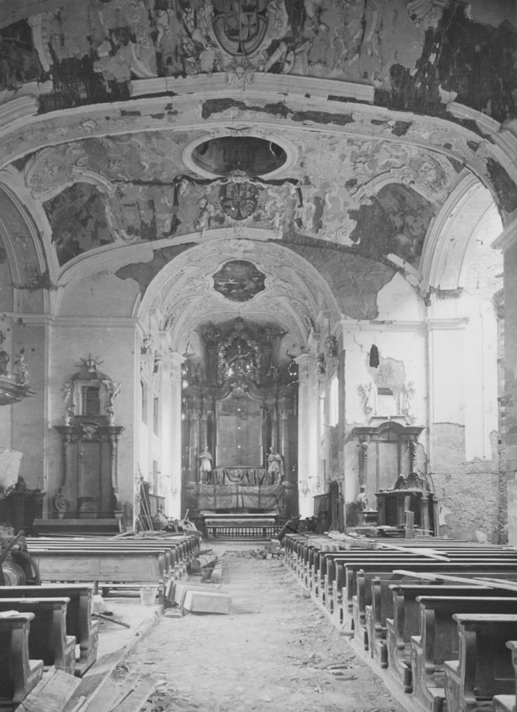 Leichte Schäden: am 23.2.1945 durch Sprengbombe nördlicher Querhausarm zerstört, zahlreiche Abplatzschäden an Stuck und Fresken