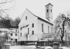 • nüchterner Saal mit eingezogenem Chor, sich verjüngendem Nordturm, Kuppelhaube mit Obelisk