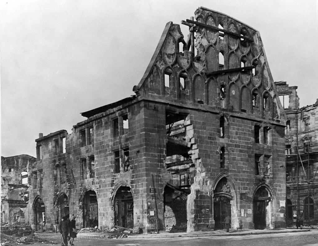 - 2. Januar 1945: ausgebrannt, die Südseite auf einer Länge von sechs Fensterachsen, der Westgiebel und die obere Hälfte des Ostgiebels ganz eingestürzt, der Ladeerker zerstört