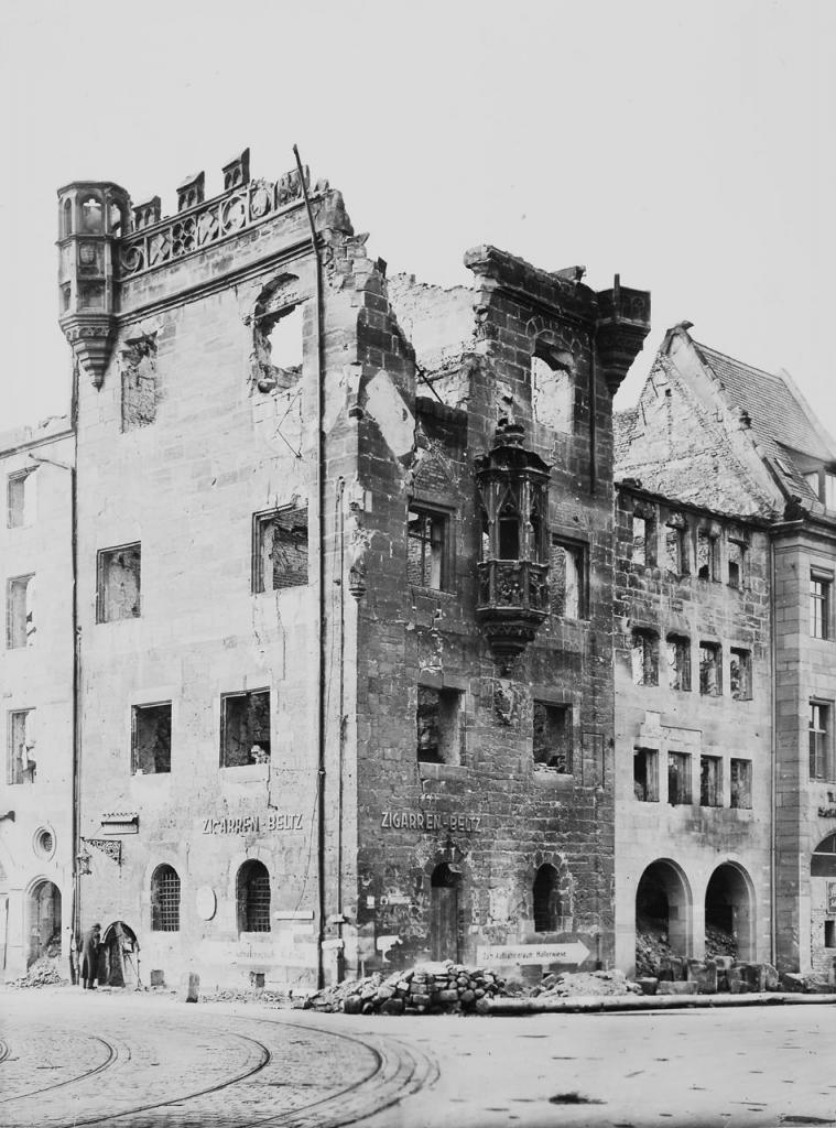 • 2. Januar 1945: ausgebrannt, die Dachgalerie und Ecktürmchen zur Hälfte abgesprengt