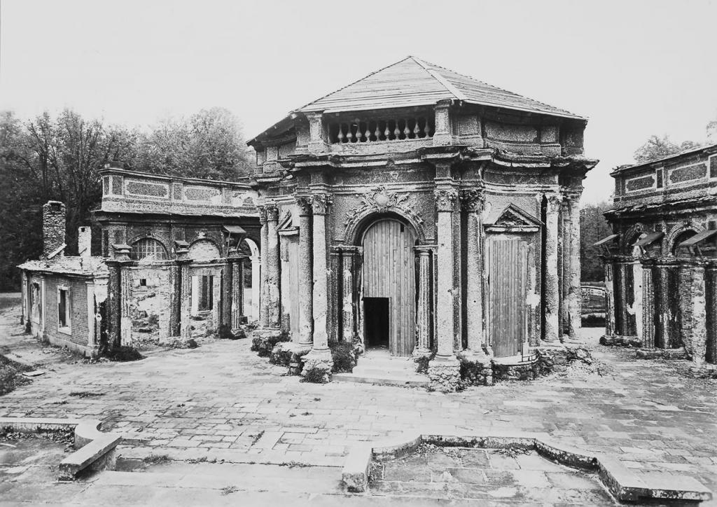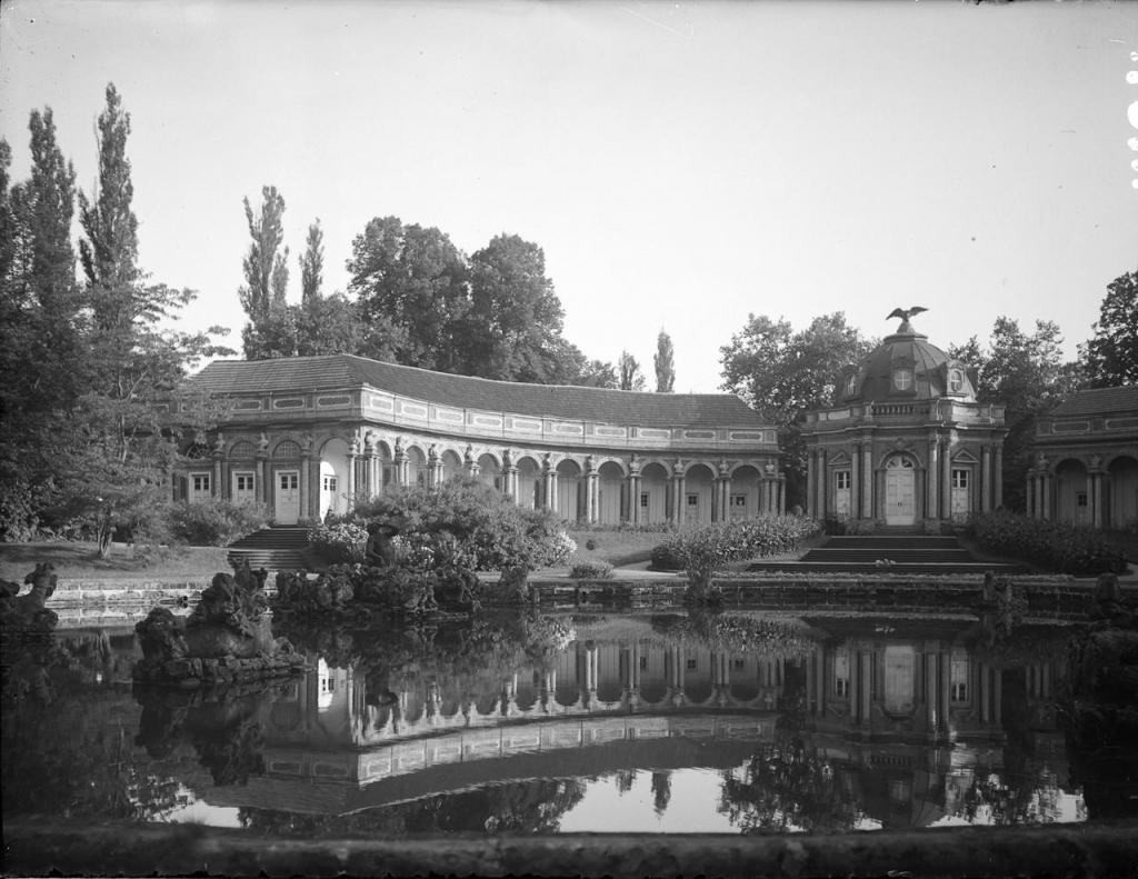 • zwei viertelkreisförmige Flügelbauten und oktogonaler freistehender Mittelpavillon (Sonnentempel)