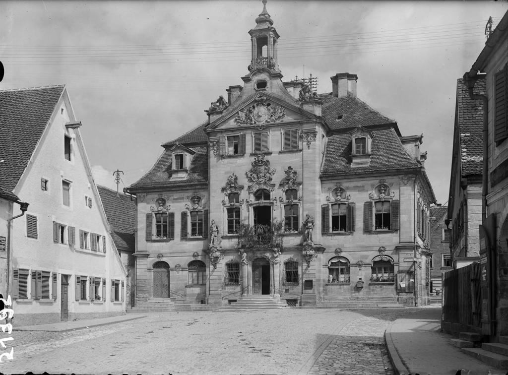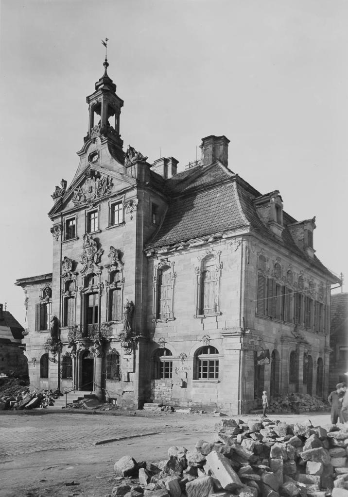 Schwere Schäden: am 23.2.1945 durch eine Sprengbombe westlicher Teil bis auf Fassadenreste zerstört, Splitterschäden an der Bauplastik