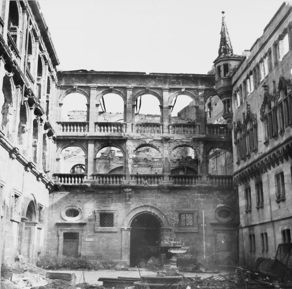 - vom Wolffschen Bau an der Nordseite durch Sprengbombentreffer etwa ein Drittel zerstört, Treppenhäuser und Arkadengänge teilweise vernichtet