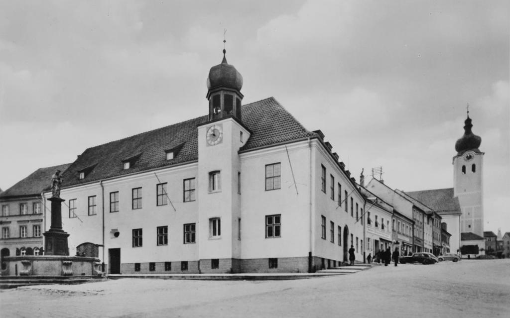 • Eckbau mit Walmdach und Dachreiter, Erdgeschoss rustiziert, der Ratssaal mit einfacher Kassettendecke