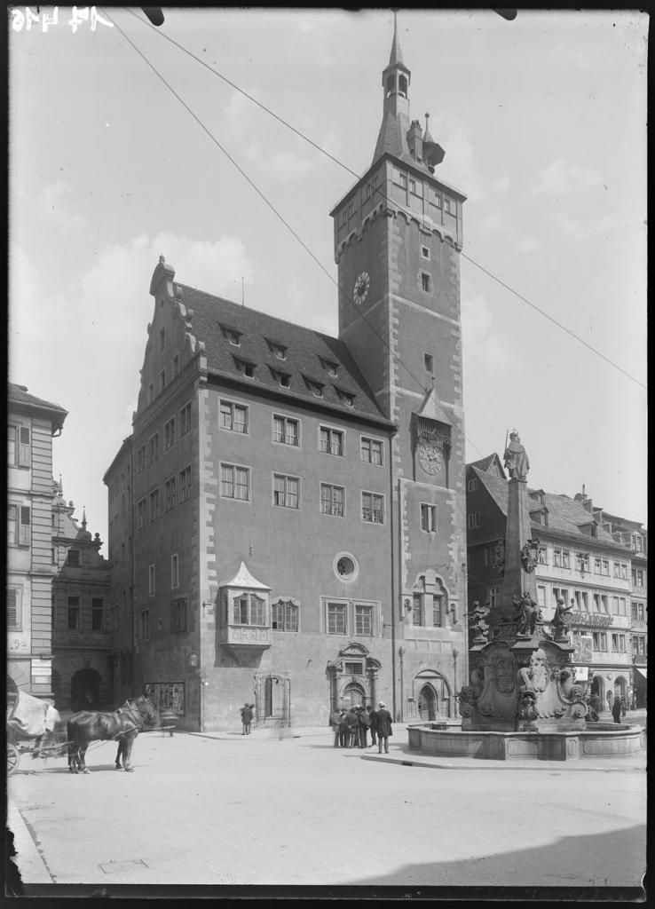 • 1577: Stadtschreiberhaus westlich gesondert erstellt von Hans Pflaumer, dreigeschossiger Bau mit Volutengiebel