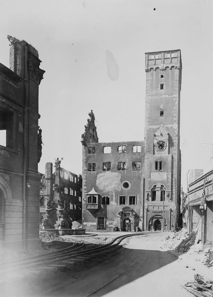 • vom Kalterhaus mit Ratskeller und Kapelle Teile des Mauerwerks eingestürzt, aber der Südgiebel erhalten, die gotische Turmspitze abgebrannt