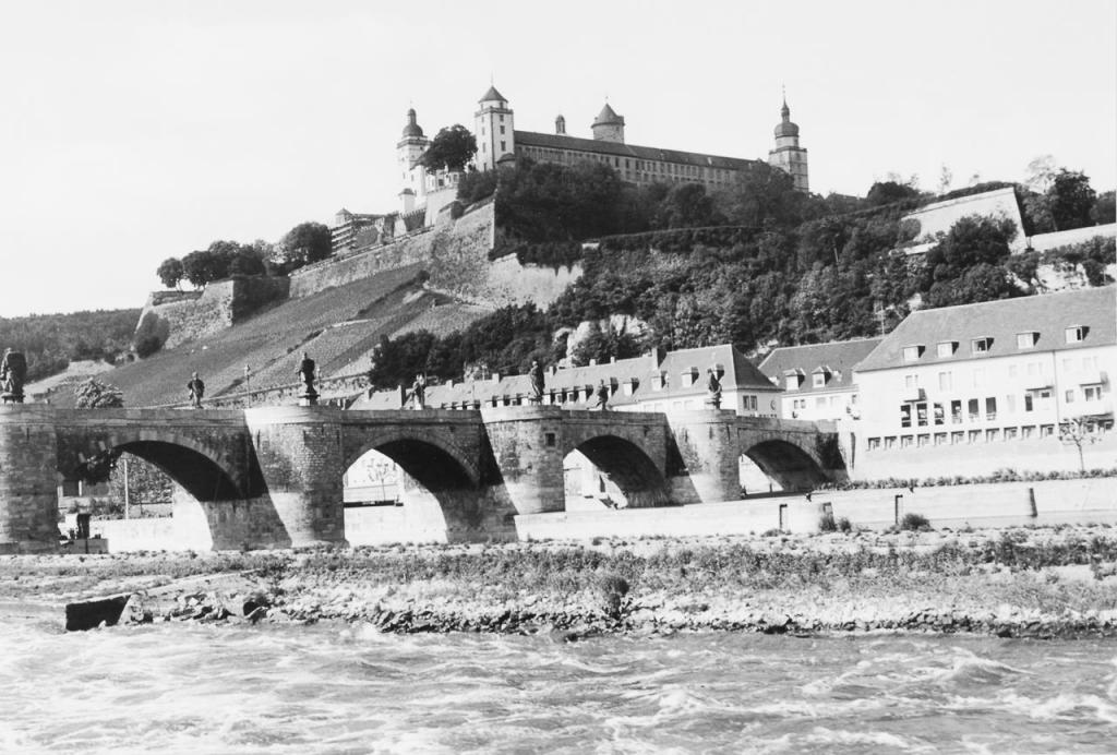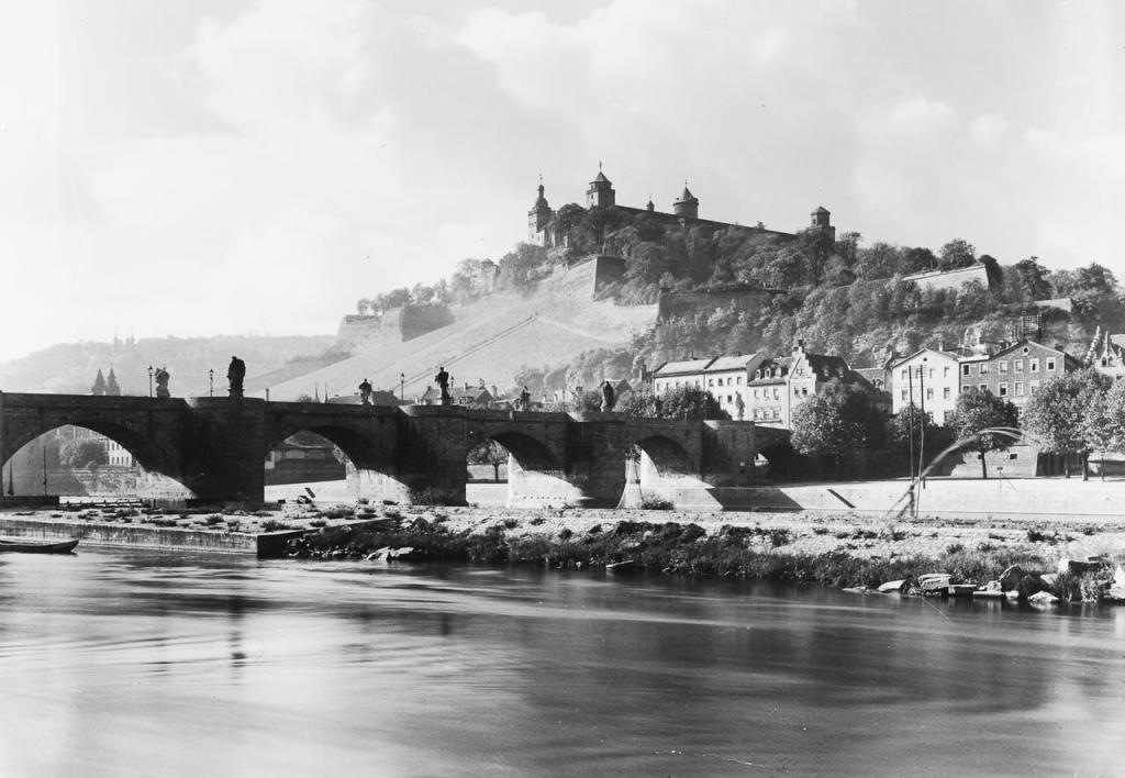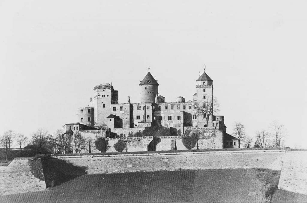 • 16.03.1945: vor allem Brandschäden am östlichen Teil der Hauptburg: ausgebrannt der Fürstenbau, der Randersackerer-, der Marien-, und der Küchenturm des Berings, der Echter-Chor der Rundkirche (Verlust von Hauptaltar und Kanzel) sowie deren Kuppeldach, der Südflügel (Bibliotheksbau) bis zum neuen Saal, die östliche Hälfte des Nordflügels (Kammerflügel), die Pavillions des Fürstengartens