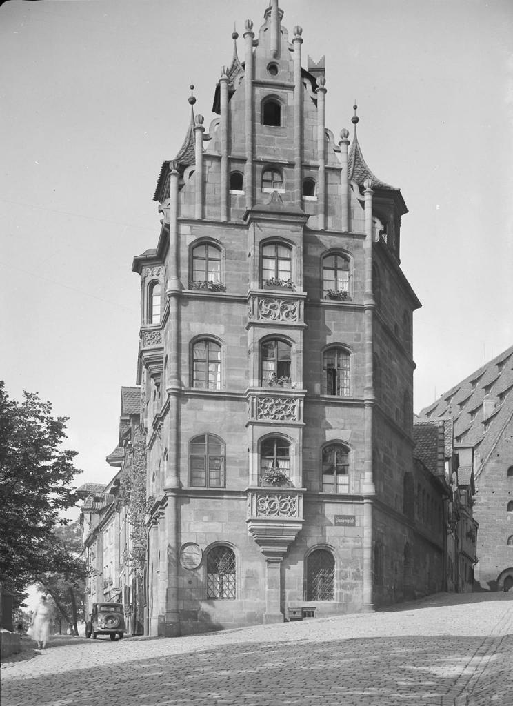 • drei zu fünf Achsen, Fialengiebel, zwei Chörlein, Dacherker, im innern Treppenaufgang mit Maßwerkbrüstung, zahlreiche Ausstattungsdetails