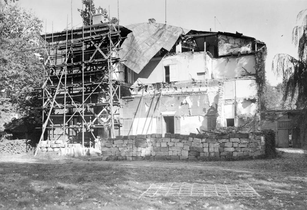 - 5. April 1945: durch britischen Luftangriff Südostteil sowie Saal mit Halbrotunde und Kellerräumen zerstört, Garten verwüstet, Mobiliar z.T. vernichtet