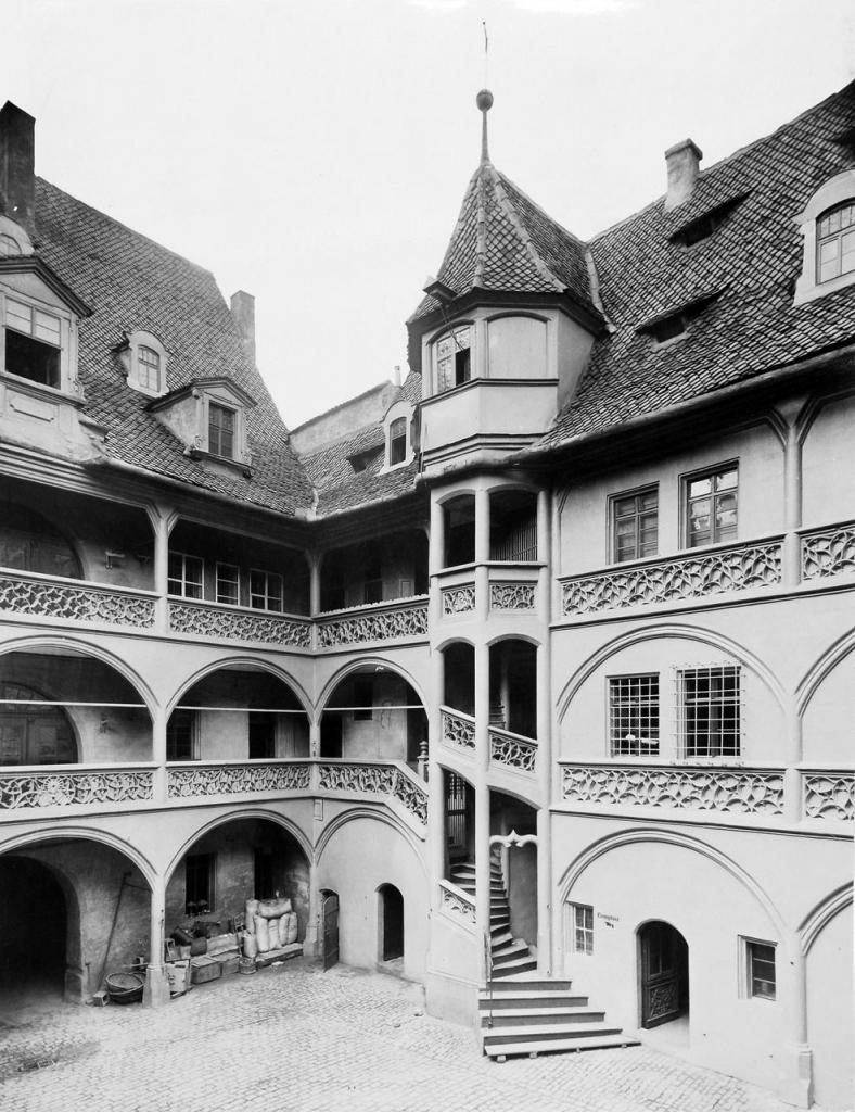 • dreiseitiger Galeriehof mit Maßwerkbrüstungen, offenem Treppenturm und Wandbrunnen