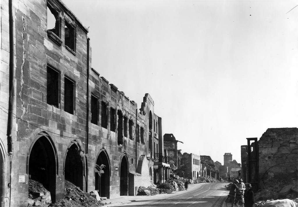 • 1960 - 1963: durch das Städtische Hochbauamt die ruinöse Ostseite bis zum Sockel abgebrochen und in modernen Formen weitgehend und ohne Bezug zur Vorgängerarchitektur wieder aufgebaut