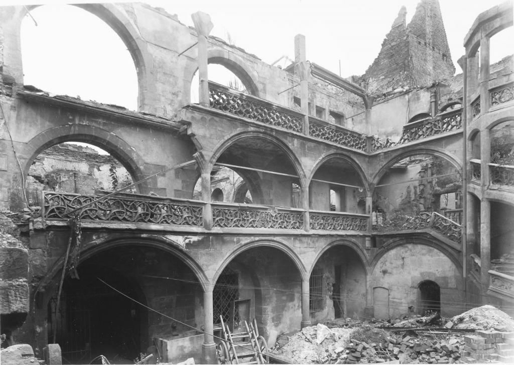 - die östliche Hofseite samt den Galerien zerstört