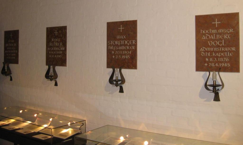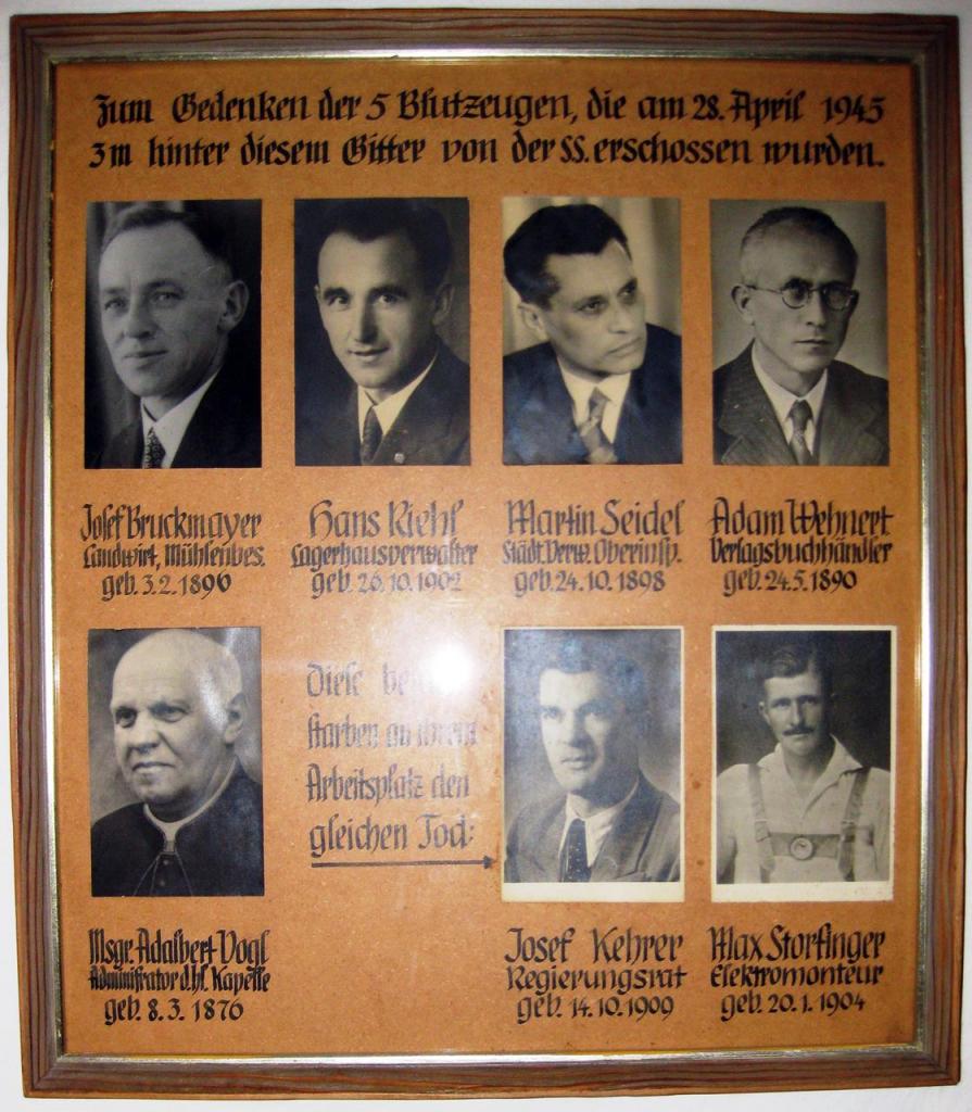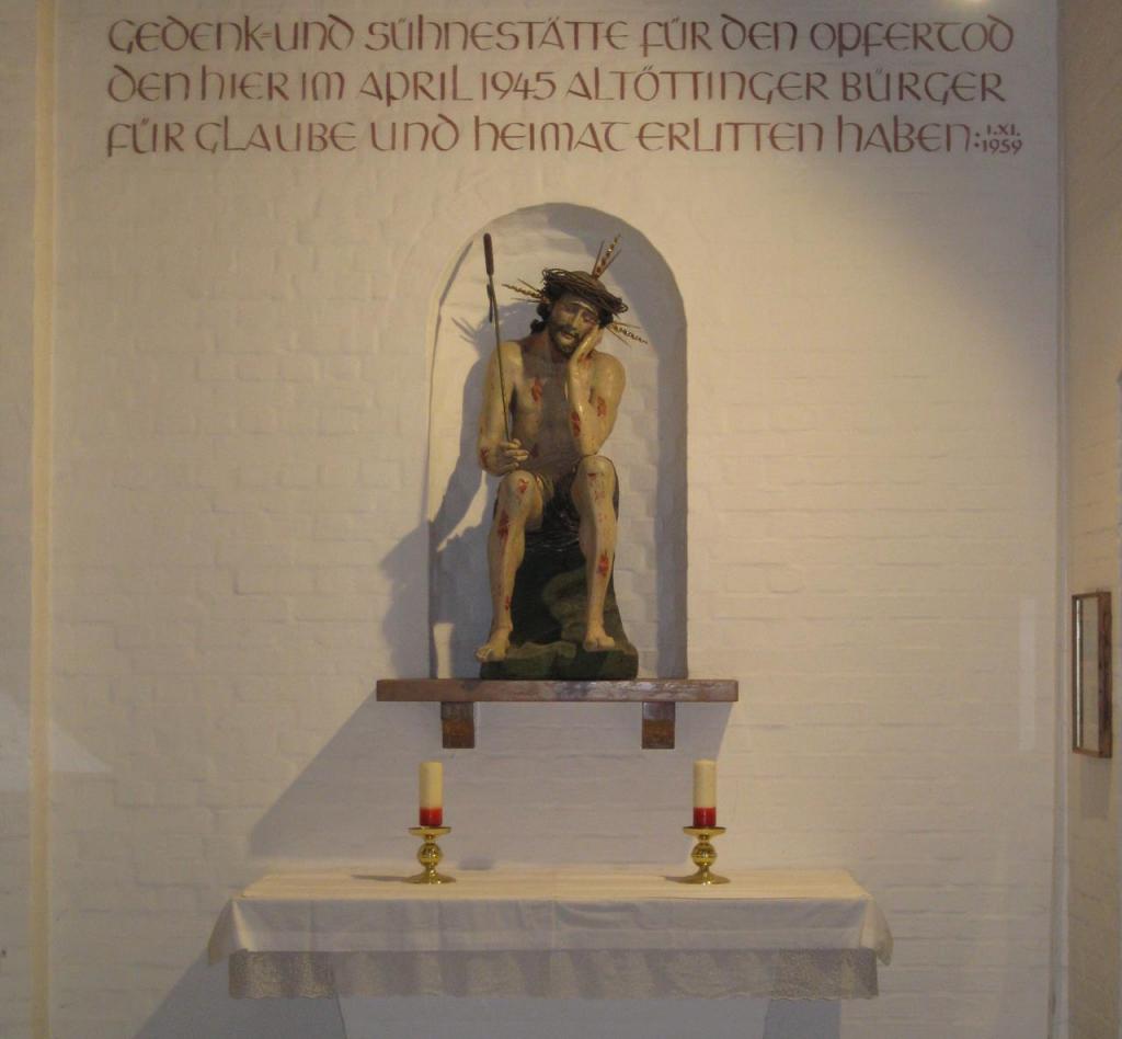 • Nach dem Krieg wurde an der Stelle, an der Ende April 1945 die 5 Altöttinger Bürger ermordet worden waren, eine Gedenkstätte errichtet, die 1959 zur Kapelle „Unseres Herren Rast“ ausgebaut und in die Stiftskirche St. Philpp und Jakob integriert wurde.