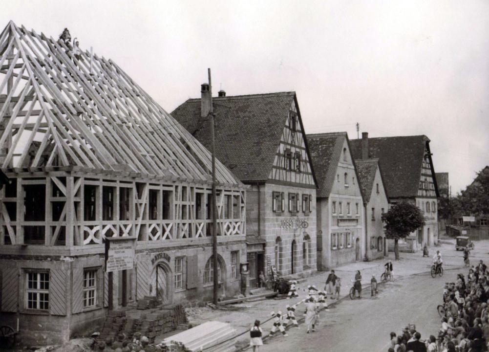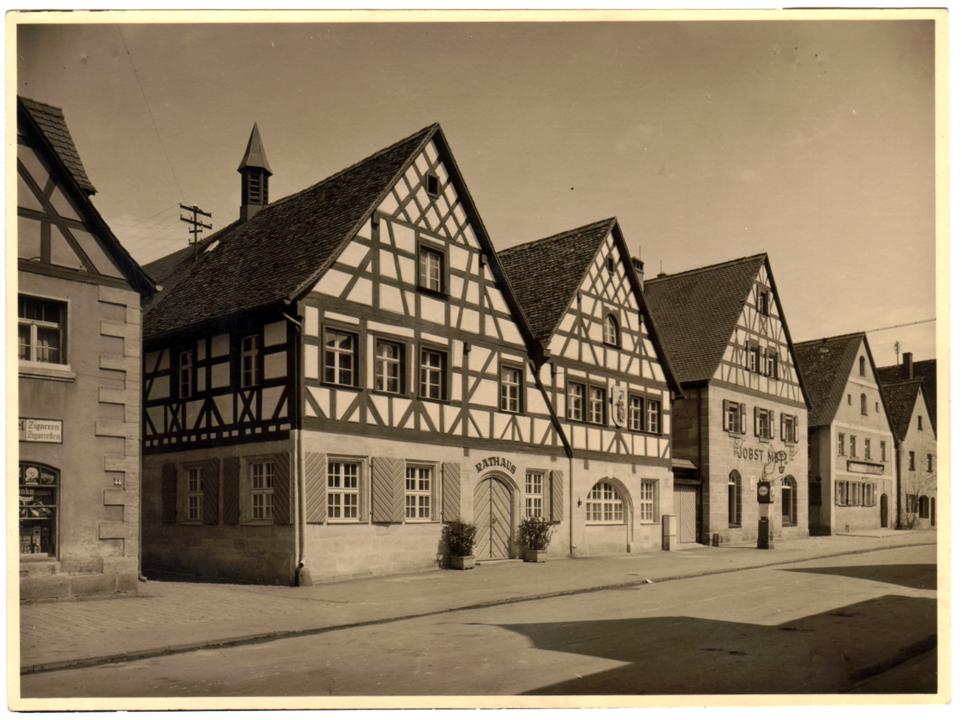 Umsetzung:• 1950: Wiederaufbau des Rathauses mit traufständischem Walmdach