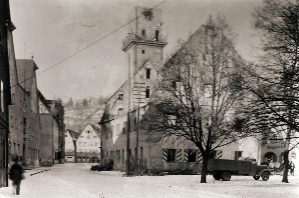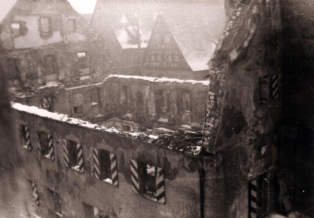 • durch Explosion vom 19. April 1945: Ausbrennen des Rathauses, dabei Vernichtung des Stadtarchivs