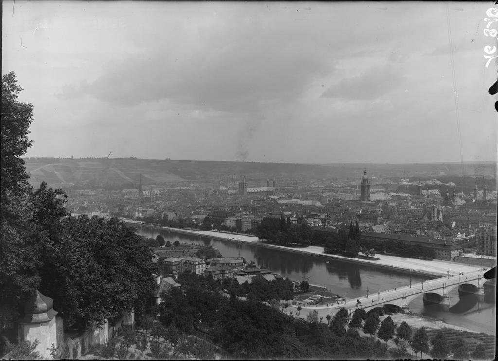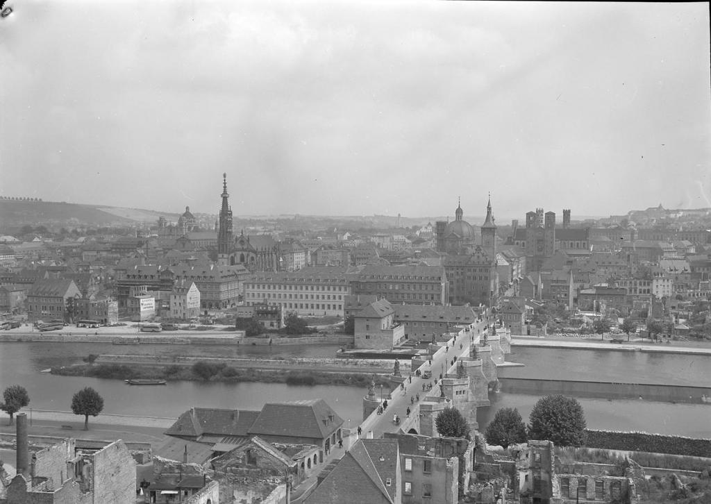 1945 wurde Würzburg mehrfach zum Ziel von Luftangriffen. Der schwerste davon ereignete sich am 16. März 1945. Er entfachte einen Feuersturm, der rund 5.000 Menschen das Leben kostete, 90.000 wurden obdachlos. 82% der Bausubstanz und 90% der historischen Innenstadt, darunter die wichtigsten Architekturdenkmale wie die Residenz oder der Dom, wurden zerstört oder beschädigt. Nach Gefechten wurde die Stadt am 06./07.04.1945 an die Amerikaner übergeben. Nach Plänen von Hubert Groß, Rudolf Schlick und Paul Heinrich Ottes erfolgte der (Wieder-)Aufbau. In der Innenstadt behielt man die Grundrisse - wenn auch teils autogerecht abgewandelt - bei und rekonstruierte zumindest äußerlich zahlreiche wichtige Baudenkmale wie die Residenz und die Kirchen. Am Stadtrand wurden Trabantensiedlungen wie etwa Heuchelhof errichtet.